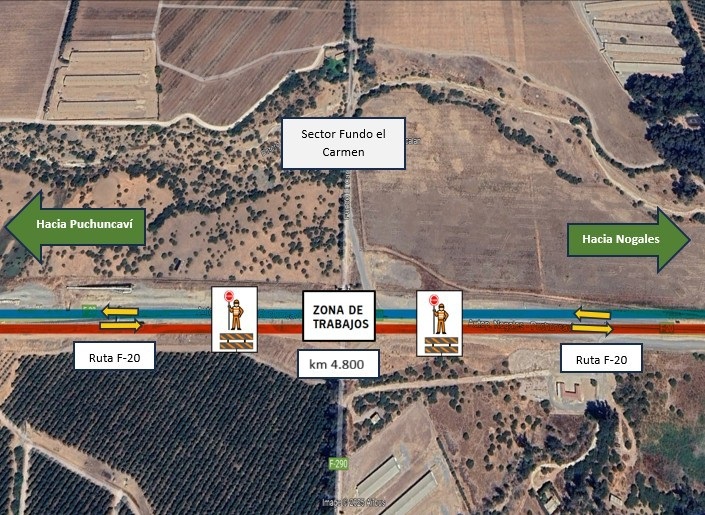 La Sociedad Concesionaria Nuevo Camino Nogales – Puchuncaví informa que, en semana del 13 de octubre, se realizarán cortes temporales de tránsito en la ruta F-20 en sector de Fundo el Carmen en comuna de Nogales, km 4.800.