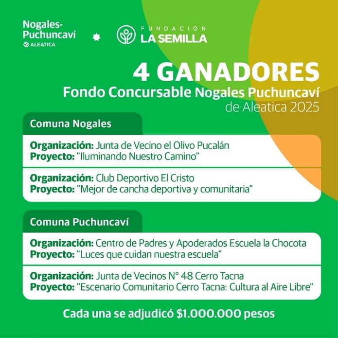 Por medio de un proceso de postulación, este proyecto – primera versión impulsada por la concesionaria Nogales Puchuncaví y ejecutada por Fundación La Semilla – busca fortalecer a las organizaciones locales a través del financiamiento de iniciativas con impacto social, territorial y sostenible, promoviendo la colaboración entre la comunidad, la concesionaria y los distintos actores del territorio.